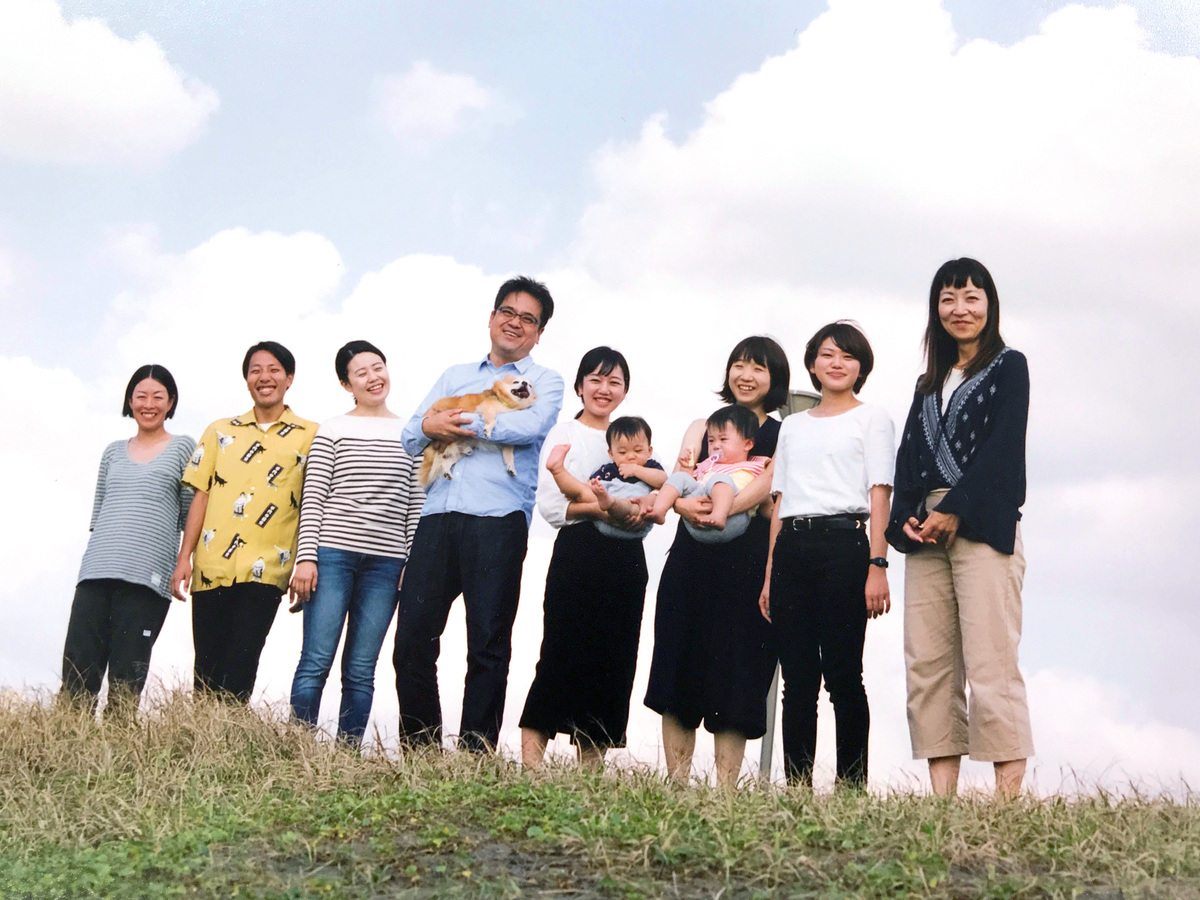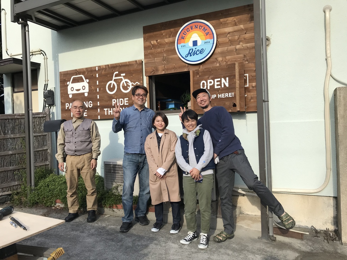 おにぎり屋さんのロゴマークと看板をデザインしました。実際に食べたおにぎりの味や、スタッフさん・お店の雰囲気を表現。お客様と一緒に、完成の記念撮影です。