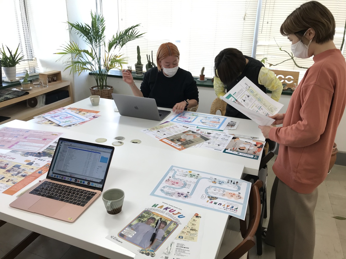 社内会議の様子。学校案内のパンフレットのデザインチェックです。学生が喜ぶような、コンセプトにあったものになっているか、デザイナーと話し合いを行って進めていきます。